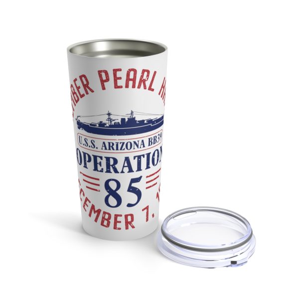 Honor history and functionality with our ‘Remember Pearl Harbor!’ 20oz Tumbler, a meaningful way to support the USS Arizona “Operation 85” while enjoying your favorite beverages. Each purchase of this elegantly designed tumbler contributes to the noble efforts of Operation 85, making it a significant addition to your daily routine.