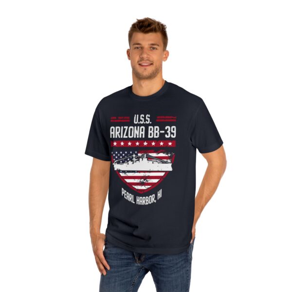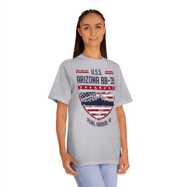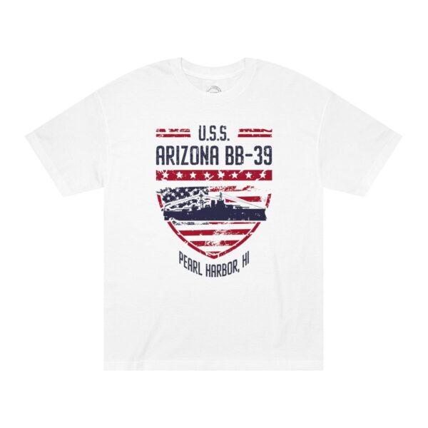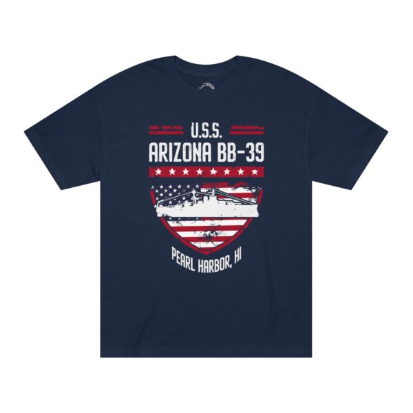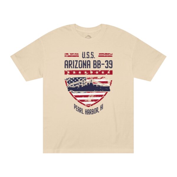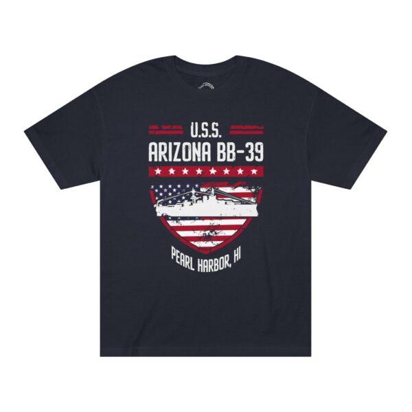 Show your pride. Honor their sacrifice. This U.S.S. Arizona BB-39 Tee features a bold distressed American flag shield with the legendary battleship front and center — a powerful tribute to the heroes lost at Pearl Harbor on December 7, 1941.